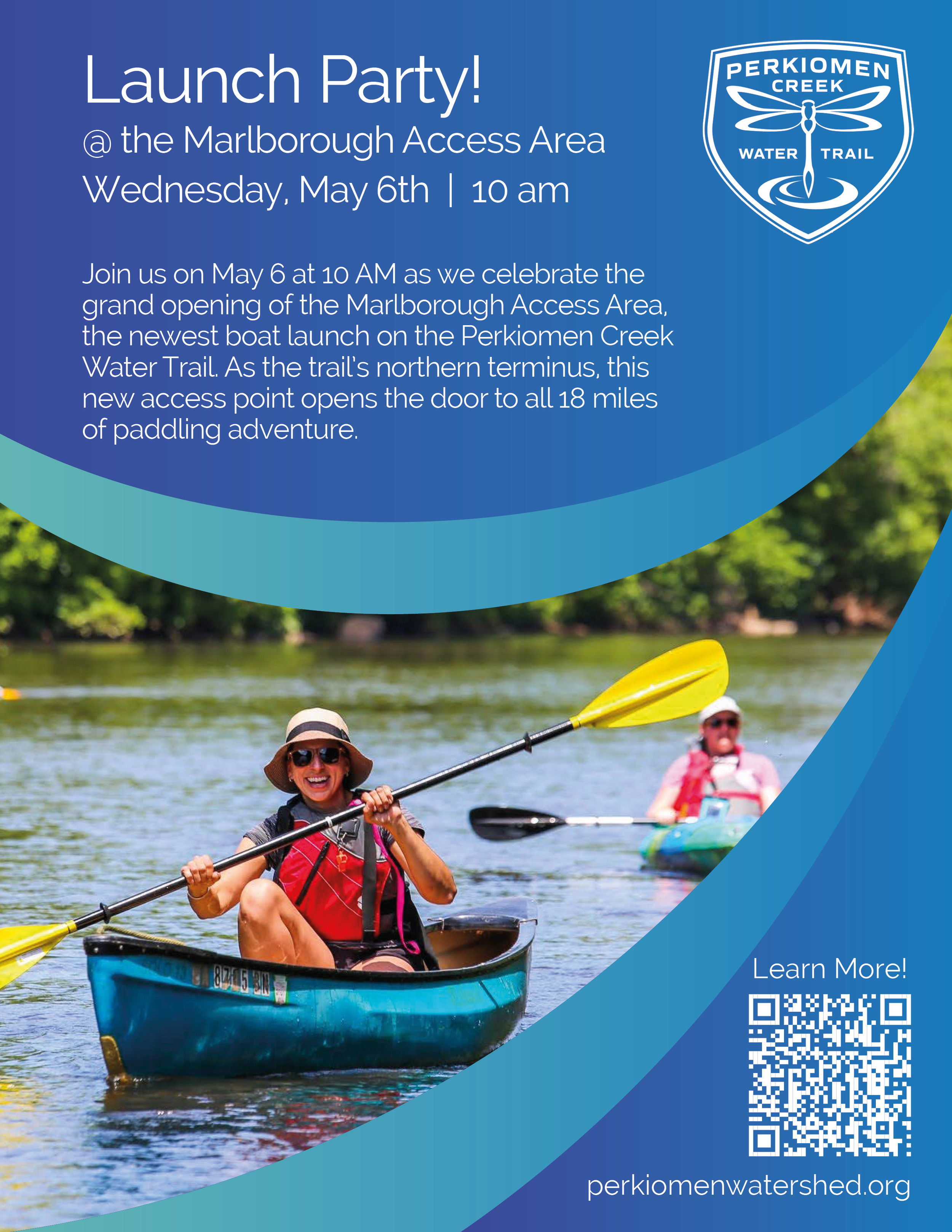 Join us on May 6 at 10 AM as we celebrate the grand opening of the Marlborough Access Area, the newest boat launch on the Perkiomen Creek Water Trail. As the trail’s northern terminus, this new access point opens the door to all 18 miles of paddling adventure.